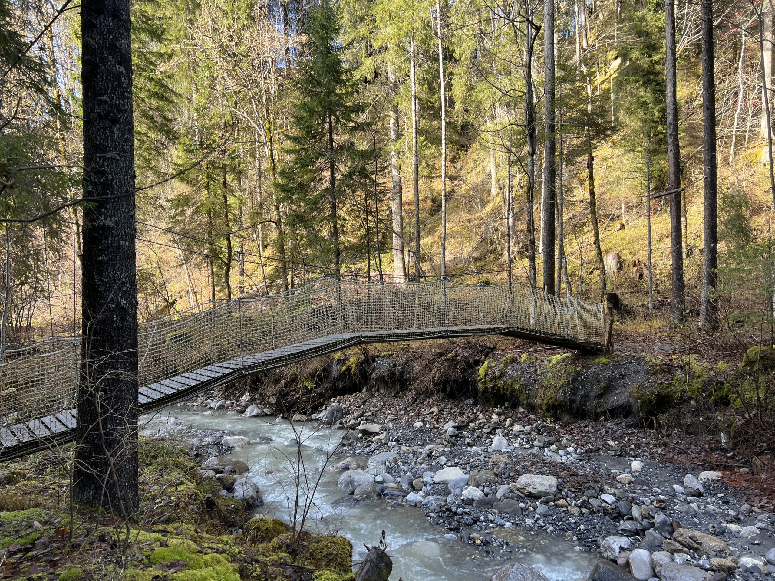 Petite réparation et ajustement de la tension des câbles, sur une passerelles suspendue. Elle a retrouvé sa jolie forme voûtée, cela donne envie de traverser, vous ne trouvez pas ?